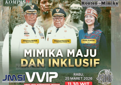 Mimika Menuju Panggung Nasional Kompas TV, JOEL Ngobrol Tentang “Mimika Maju dan Inklusif” 25 Maret 2026, 06:40 am Kepala Daerah Mimika, Johannes Rettob dan Emanuel Kemong paparkan strategi pemerataan pembangunan hingga wilayah pesisir…