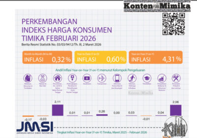 Inflasi Tahunan Timika Tembus 4,31 Persen, Dipicu Lonjakan Harga Perawatan Pribadi dan Perumahan 03 Maret 2026, 19:39 pm Timika, KontenMimika.com – Badan Pusat Statistik (BPS) Kabupaten Mimika melaporkan bahwa pada Februari 2026, Kota…