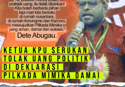 Ketua KPU Mimika Serukan Tolak Uang Politik di Deklarasi Pilkada Mimika 26 September 2024, 06:30 am Timika, KontenMimika.com – KPU Kabupaten Mimika berharap penyelenggaraan pesta demokrasi rakyat Pilkada Mimika, dapat berjalan…