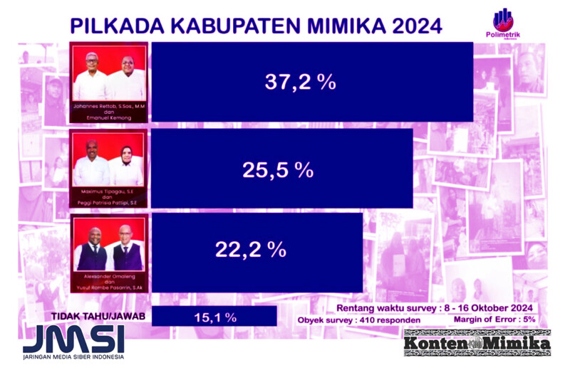 Dengan melibatkan 410 responden yang dipilih secara acak di 18 distrik, Polimetrik melakukan metode survey wawancara tatap muka langsung warga Mimika dalam kurun waktu 8-16 Oktober 2024. Hasilnya secara garis besar menunjukkan persaingan ketat antar paslon dalam memperebutkan elektabilitas dan popularitas.