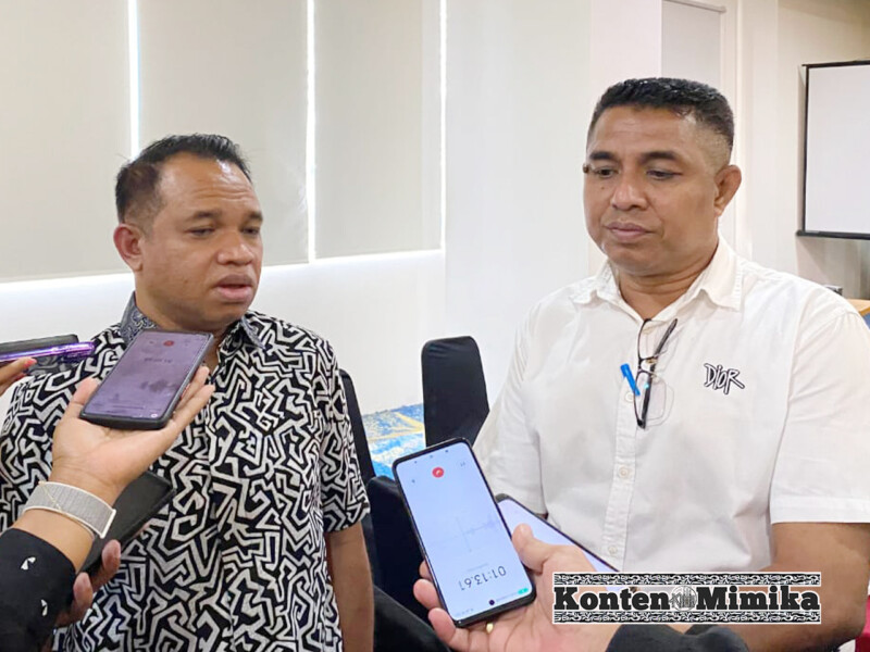 (Komisioner KPU Mimika Hironimus Kia Ruma (kiri baju motif hitam putih) dan Fransiskus Xaverius Ama Bebe Bahy (kanan) diwawancara wartawan di sela kegiatan, Senin 22 Juli 2024)