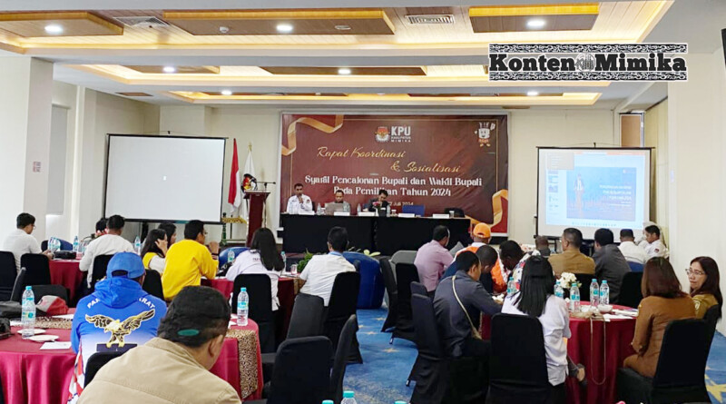 Timika, KontenMimika.com — KPU Kabupaten Mimika, Papua Tengah mengadakan Rapat Koordinasi (Rakoor) dan Sosialisasi Syarat Pencalonan Bupati dan Wakil Bupati, Gubernur dan Wakil Gubernur pada Pilkada Serentak 27 November 2024, Kegiatan digelar di Horison Jalan Hassanudin Senin 22 Juli 2024.
